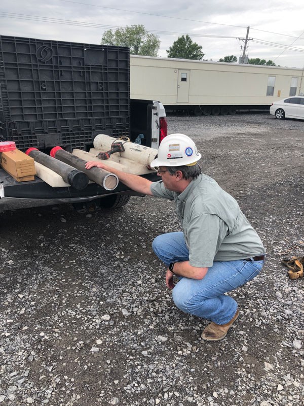 AAPG member Steve Walkinshaw inspecting a freshly cut core barrel segment during drilling of the Class V Stratigraphic Test Well at the Louisiana Green Fuels proposed sequestration site in 2021. Walkinshaw is responsible for geological and geophysical site characterization, all well planning and geological oversight, and the formal submission of all Class VI Permit applications.