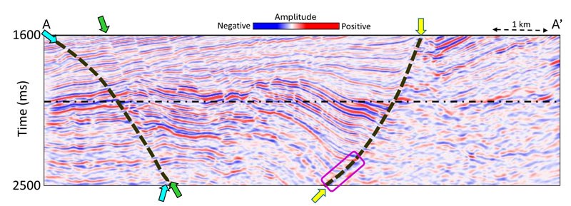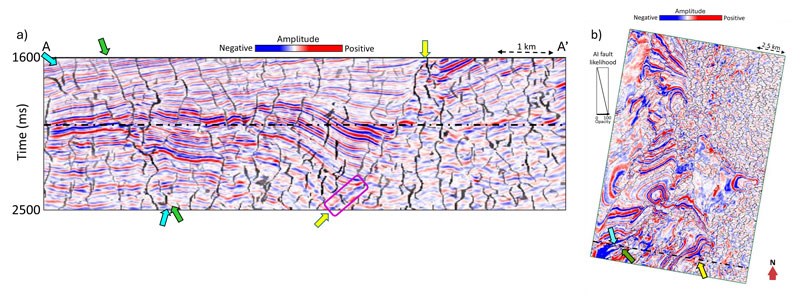 Figure 1a shows vertical slice AA’ through the seismic amplitude volume where we see several faults are visible in the middle, along with a prominent fault on the right, marked with yellow block arrows. There are two faults on the left marked with green and cyan block arrows. While the fault represented by the green arrows looks to be linear and clearly interpretable, the fault marked with the cyan arrows has a curved signature which is not so clear. Figure 1b shows a time slice through the same volume at t= 2.0 seconds (the location of which is indicated on the crossline section in figure 1a). The sharp amplitude breaks in this display highlight the fault locations. The location of the faults marked with green and cyan arrows are shown with the dots of the same individual colors.