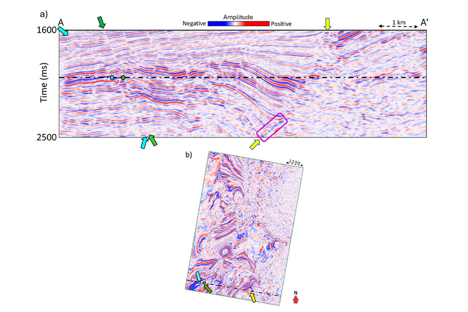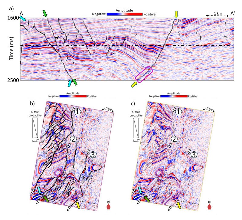 Figure 5 displays both the corendered crossline section and time slice displays computed using AI and convolutional neural networks using a 64 by 64 2-D analysis window. The predicted faults are now clearly defined and continuous, which was the desired outcome. It may be mentioned specifically, how, among others, the faults marked as 1, 2 and 3 (with their ends indicated with white block arrows in figure 5b) stand out clearly as compared with the displays in figures 1b, 2b and 3b, and their interpretation is likely to impact the bottom-line.