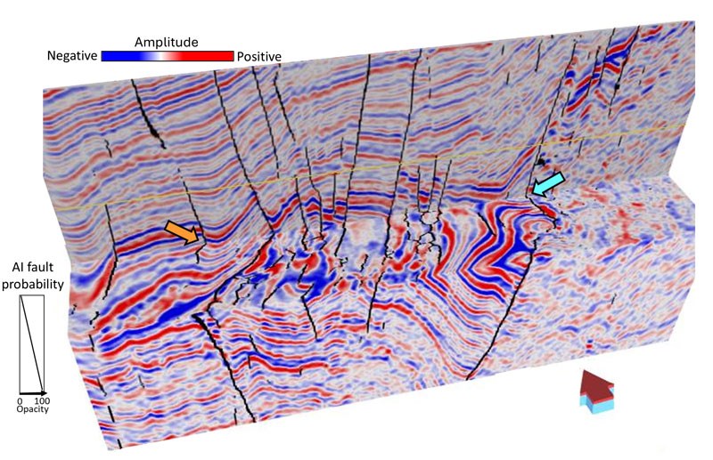 Finally, we generated a chair display from the 3-D corendered sub-volume for the seismic and AI fault probability volumes, as shown in figure 6. The faults at the locations marked by the orange and cyan block arrows are well-defined, and the fault plane corresponding to the cyan block arrow is now clearly interpretable.