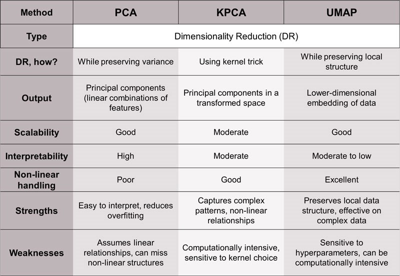 Figure 3: Comparison of selected machine learning dimension reduction algorithms. During the selection process, it is important to note how each algorithm works, its scalability, interpretability, handling of nonlinearity and its strengths and weaknesses.