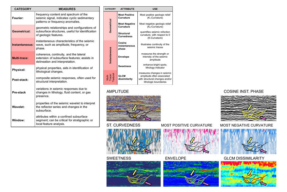 Seismic attribute selection is a critical first step for the effective geologic interpretation of seismic data. Furthermore, the ability to align appropriate attributes with specific geologic objectives is fundamental in the identification of meaningful geologic features. As each attribute represents a calculation derived from the original seismic data, it is critical to understand both its mathematical foundation and the targeted feature it was designed to enhance. Recognition of the inherent uncertainty of each attribute underscores the interpreter’s role in verifying the use of the attribute for the interpretations. To implement this understanding methodically, one should first consider the hierarchical categories of seismic attributes (figure 1a) and select those whose application most closely meets the interpretive goal.