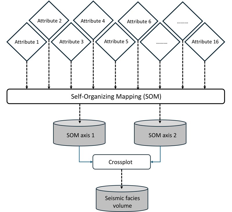 Figure 2 shows the SOM seismic facies analysis workflow. Sixteen input attributes were used for the SOM computation. The SOM-1 and SOM-2 components were generated using the input volumes and assigning equal weights to each of them, and then the computation was repeated by assigning different weights to them for SOM computation. The SOM computations were carried out on stratal volumes of attribute data generated about an interpreted horizon, 400 milliseconds above it, which encompassed the main channel seen in the different displays.