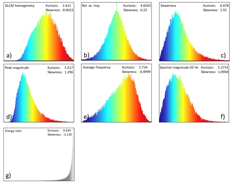 Figure 3: Histograms for some of the seismic attributes as indicated in the inset for each display, together with their respective computed kurtosis and skewness values. High values of kurtosis are seen for histograms of attributes seen in color (figures a to f), whereas a high value of skewness is seen for the histogram seen in black and white for coherence (figure g).