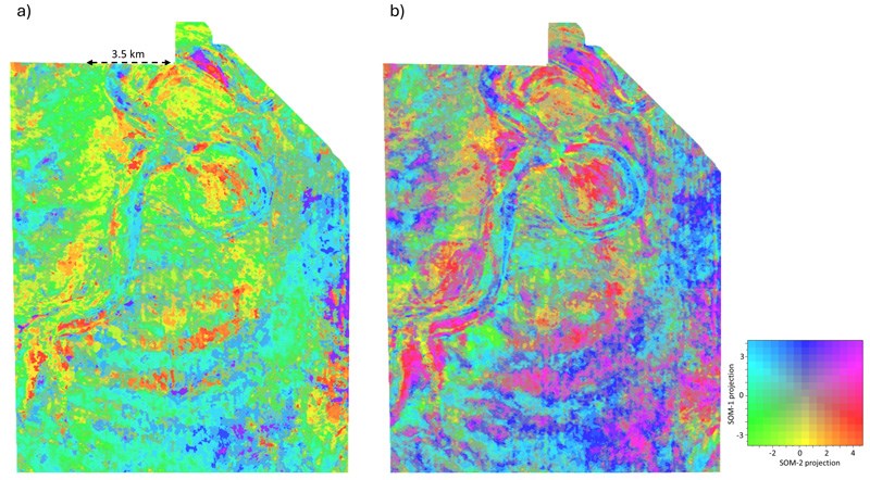 There is a well-established unsupervised ML technique, called self-organizing mapping, which has been applied to a seismic data volume from New Zealand (figure 1). We find that SOM can enhance spatial resolution and, therefore, assist in seismic interpretation. ML algorithms do not replace the interpreter; rather, the interpreter now needs to bias their area of investigation and training data to address their objectives, choose an appropriate suite of attributes, modify the attribute histograms, and weight the attributes to obtain an accurate result.