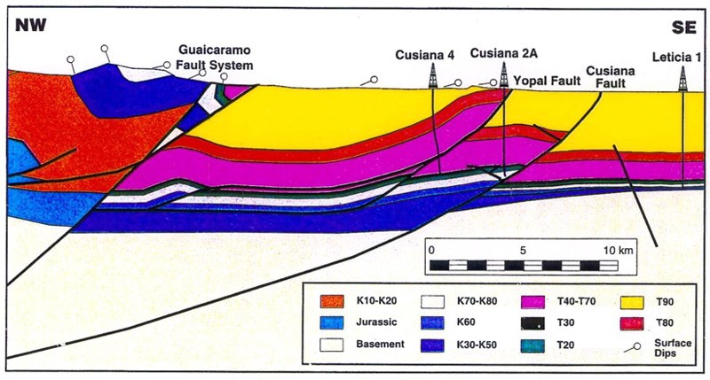 Cross- section of Cusiana prospect from E. C. Cazier et al. AAPG Bulletin 79/10. Source rock: K60; reservoirs: K80, T20, T30