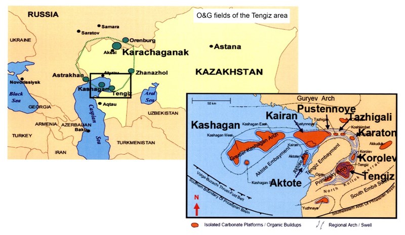 With the rumor of a possible opening by Kazakhstan of part of the offshore Caspian Sea to exploration, most major companies started to consider being part of the action around 1990. The North Caspian Basin is a circular intracratonic basin which contains several giant onshore fields on its margin, including Karachaganak in the north (gas and condensate), Tengiz (oil) in the east and Astrakhan (oil) on the Russian side in the west.