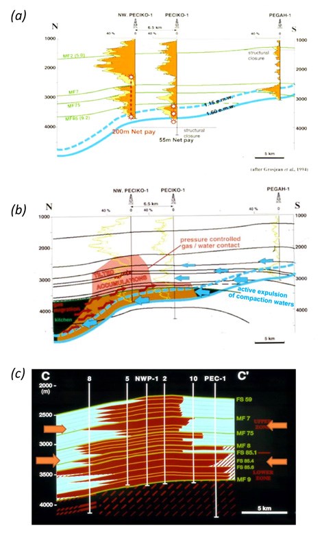 (a) The northwest-1 Peciko discovery (b) Field trapping model (c) Peciko field. Flow units and their tilted gas-water contacts from Y. Grosjean, 1994.