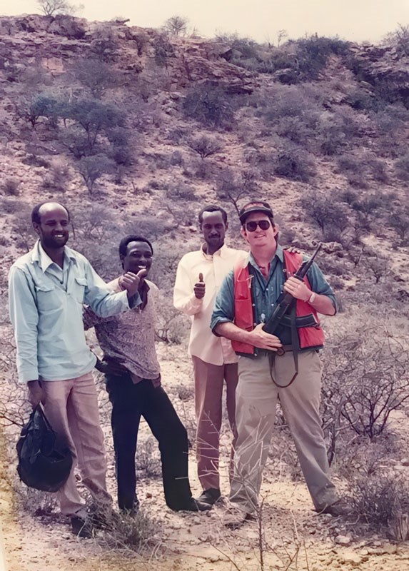 Aldrich doing field work in the Ogaden Basin of Ethiopia. He borrowed the AK-47 from his guard for the photo.
