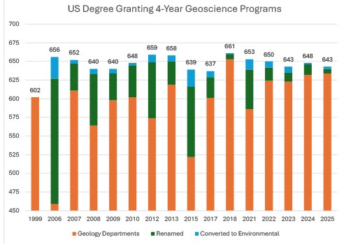 This data shows that in the past seven years, 18 geoscience departments have been shuttered or rolled into environmental studies or other similar departments. This dropped the total count of geoscience programs granting four-year degrees from 661 to 643 (3-percent decline).