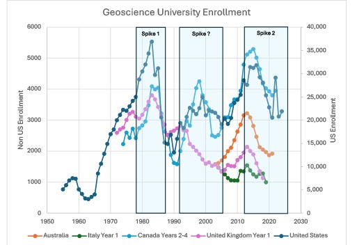 The short answer appears to be enrollment. Student geoscience enrollments across the globe are cyclical and presently are heading downward. Several spikes in enrollment data can be observed in the early 1980s, the late ‘90s to early 2000s, and from 2010 to 2020 (figure 2).