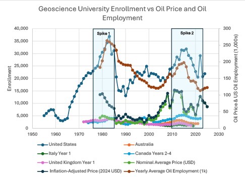 Figure 3: A comparison of university geoscience enrollments at the country level over time versus oil price (inflation adjusted for 2024) and US oil extraction employment. Data sources for oil price and employment include the Federal Reserve Bank of St. Louis and the U.S. Energy Information Administration.