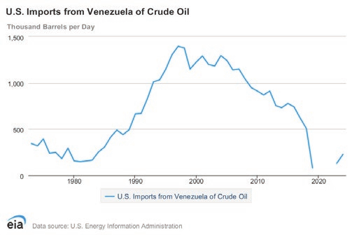 A devastating 13-year production decline sets in, under the last years of Chavez and the presidency of Nicolas Maduro. The reason is, really, “All of the above.” Economic sanctions, underinvestment, infrastructure and equipment failure, mismanagement, corrupt governance, a global oil-price collapse, a worldwide pandemic – all contribute to the decline.