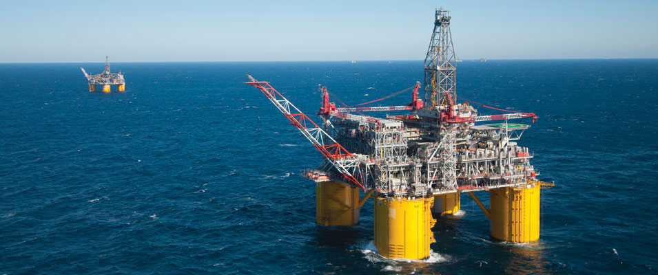Shell’s Olympus platform (foreground) and Mars platform (background) in the Gulf of Mexico. Photo courtesy of Shell