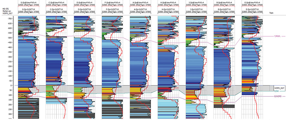 Reviewing the Mississippian carbonate to Woodford Silt to Woodford Shale impedance profiles in Wells F, A, H, I and B (labeled tracks 4, 5, 6, 7 and 8, respectively, at the base of each well), one observes the higher carbonate Zp to a lower silt Zp, overlying a relatively lower shale Zp. However, Wells C and D (tracks 10 and 3) show that silts can sometimes have equivalent Zp or slightly greater Zp than the overlying silt, which can be problematic for those trusting in a “Zp-only“ methodology to map out silts and shales. Moreover, looking at these nine wells, one can see that silt impedance varies from well to well just as the shales do – indicating a variable response across the area that will make it difficult to use a specific Zp color key that reflects solely the occurrence of silt or shale. To remedy this, seismic object detection is used to classify the silts, shales and carbonates.