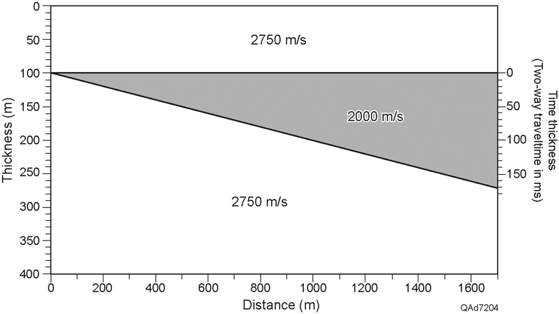 The threshold thickness above which the measured amplitude (figure 3c) gives the correct reflectivity of the top of the wedge is about 5λ/8 (60 m). For wedge thicknesses less than 5λ/8, the amplitude tuning curve is characterized by two maxima at about λ/5 (19 m) and about λ/2 (45 m). These maxima occur when the central trough of the top reflection aligns first with the leading negative side lobe of the wavelet from the bottom interface and then with the trailing negative side lobe.