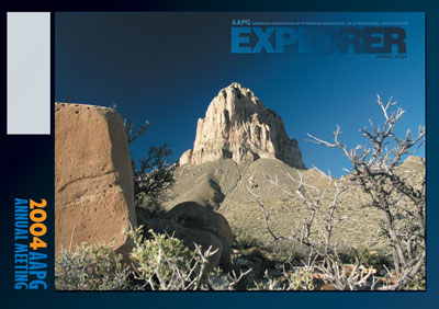 There's more to attending an annual meeting than attending technical sessions. When you're visiting Texas, some fascinating and often spectacular geology is usually nearby. For example, consider El Capitán, the showcase of the Guadalupe Mountains in western Texas. Our cover photo is taken from the surface of the Salt Flat Bench, an intra-slope mini-basin formed by slope failure and filled by subsequent turbidity flows -- good examples of "sheet" style turbidite deposition in a confined basinal setting.<br /><em>Photo by AAPG member Lisa Goggin of ChevronTexaco in New Orleans.</em>